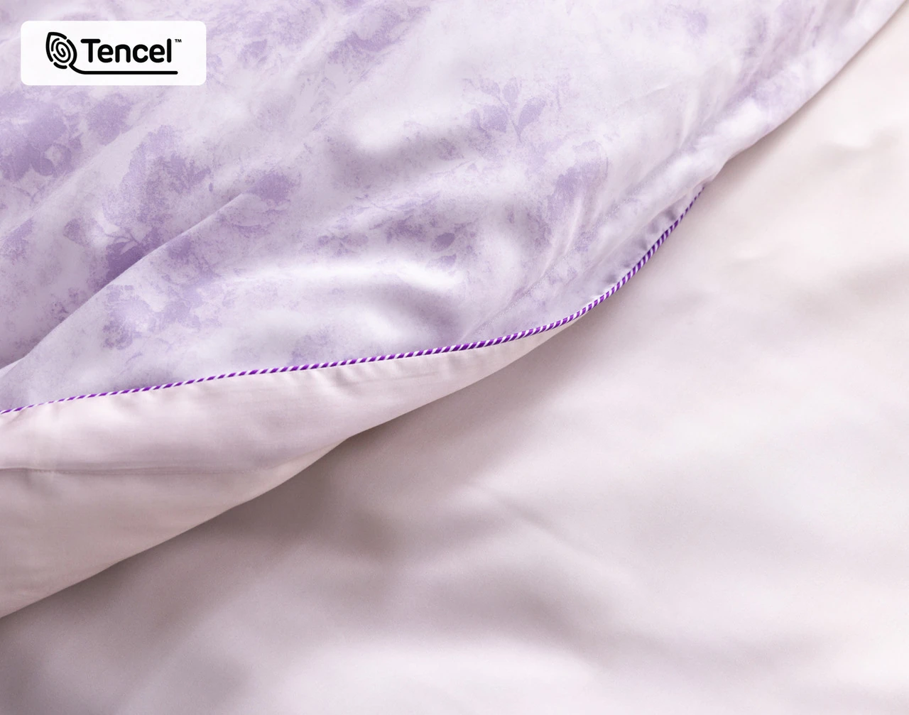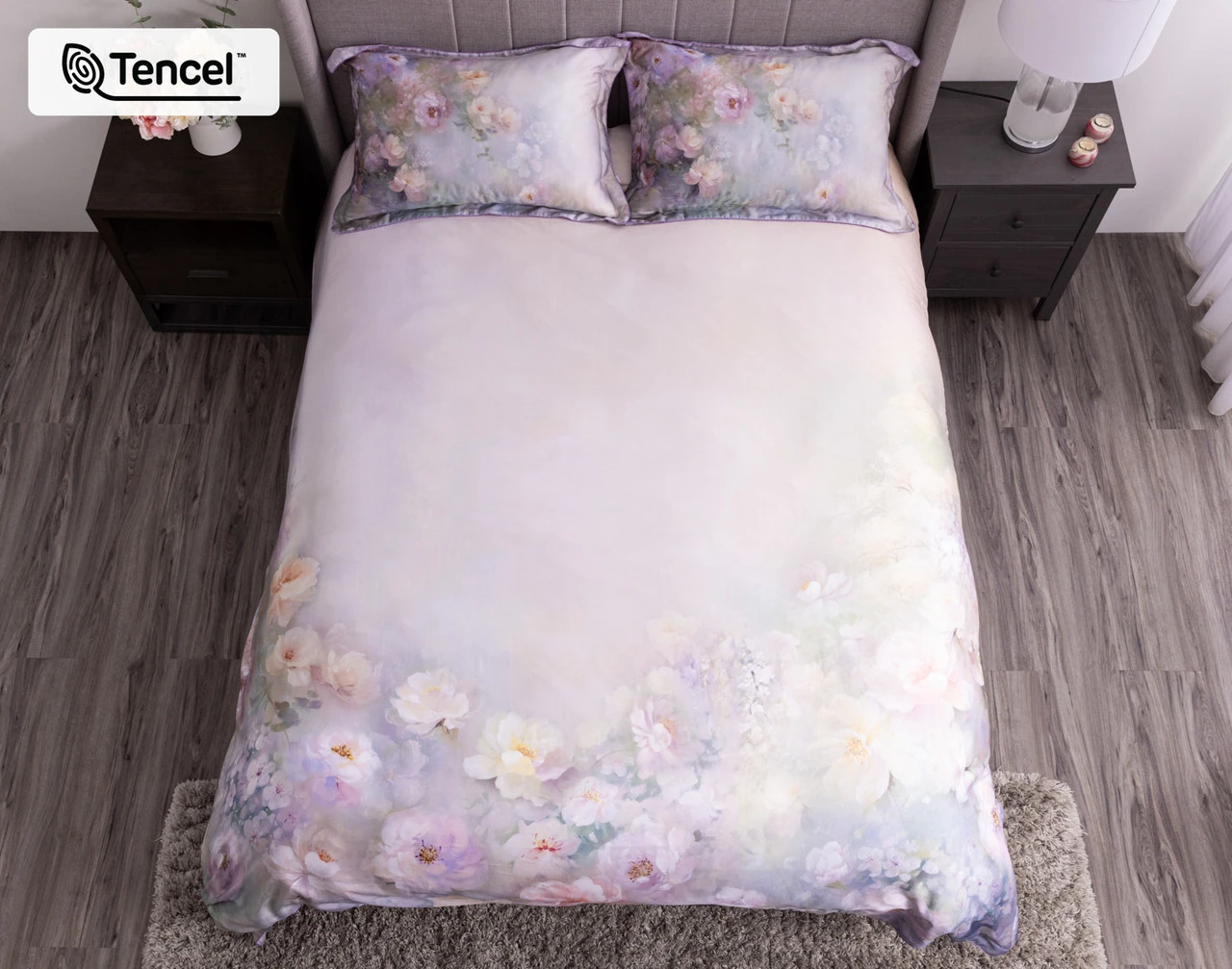 Bring springtime beauty and indulgent comfort into bed with our Constance Duvet Cover. This hand-painted watercolour design features a serene garden of tea roses in soft pastel shades, blooming beneath a sunset-inspired backdrop of warm apricot and soft lavender hues. Fully reversible, this design is backed with a distressed purple and white design for a captivating alternative. Crafted with luxuriously smooth 100% TENCEL™ Lyocell fabric, Constance offers a naturally cool touch that's gentle on skin, making for a blissful blend of style and comfort.