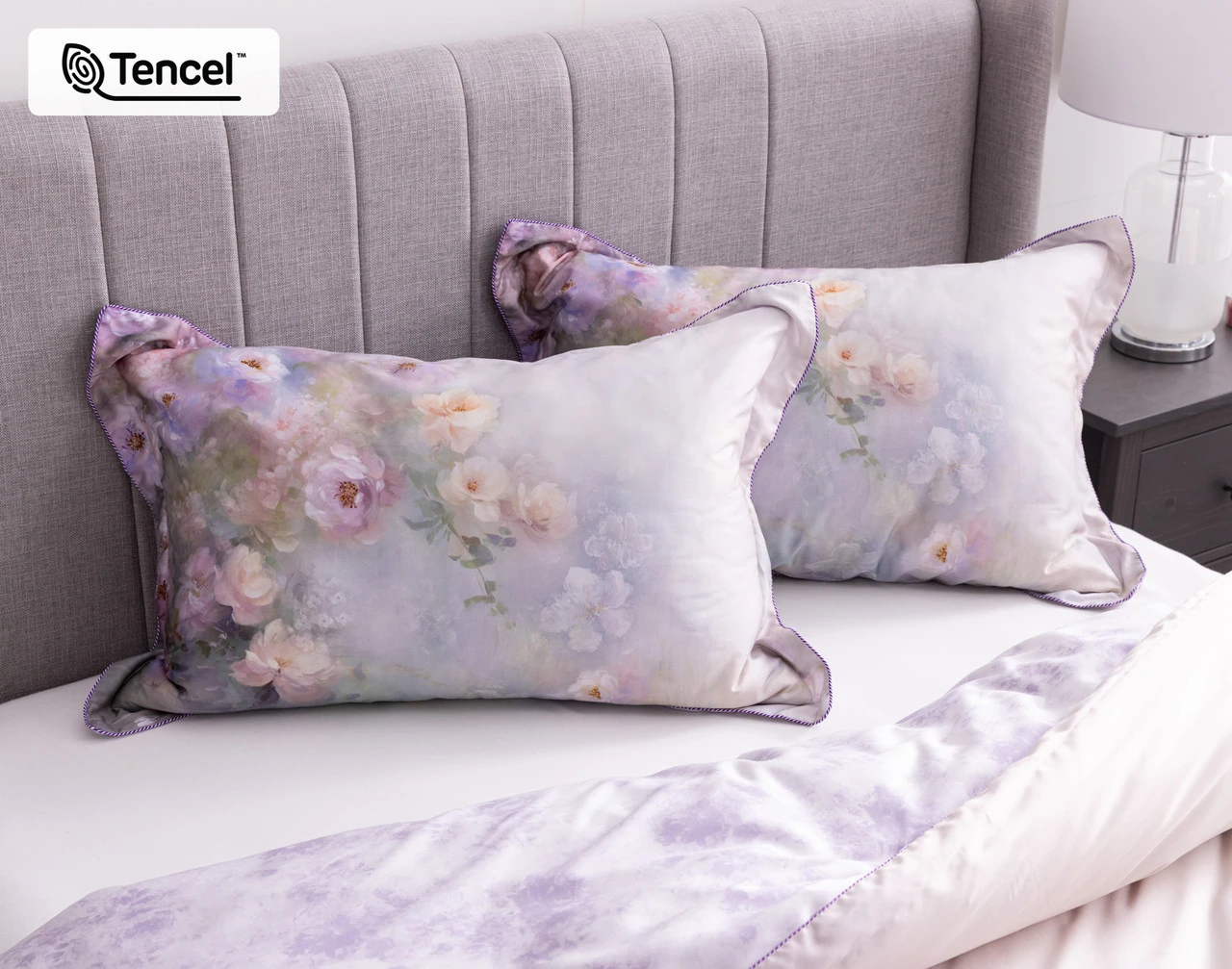 Bring springtime beauty and indulgent comfort into bed with our Constance Pillow Sham. This hand-painted watercolour design features a serene garden of tea roses in soft pastel shades blooming beneath a sunset-inspired backdrop of warm apricot and soft lavender hues. Fully reversible, this design is backed with a distressed purple and white design for a captivating alternative. Crafted with luxuriously smooth TENCEL™ Lyocell fabric, Constance offers a naturally cool touch that's gentle on skin, making for a blissful blend of style and comfort.