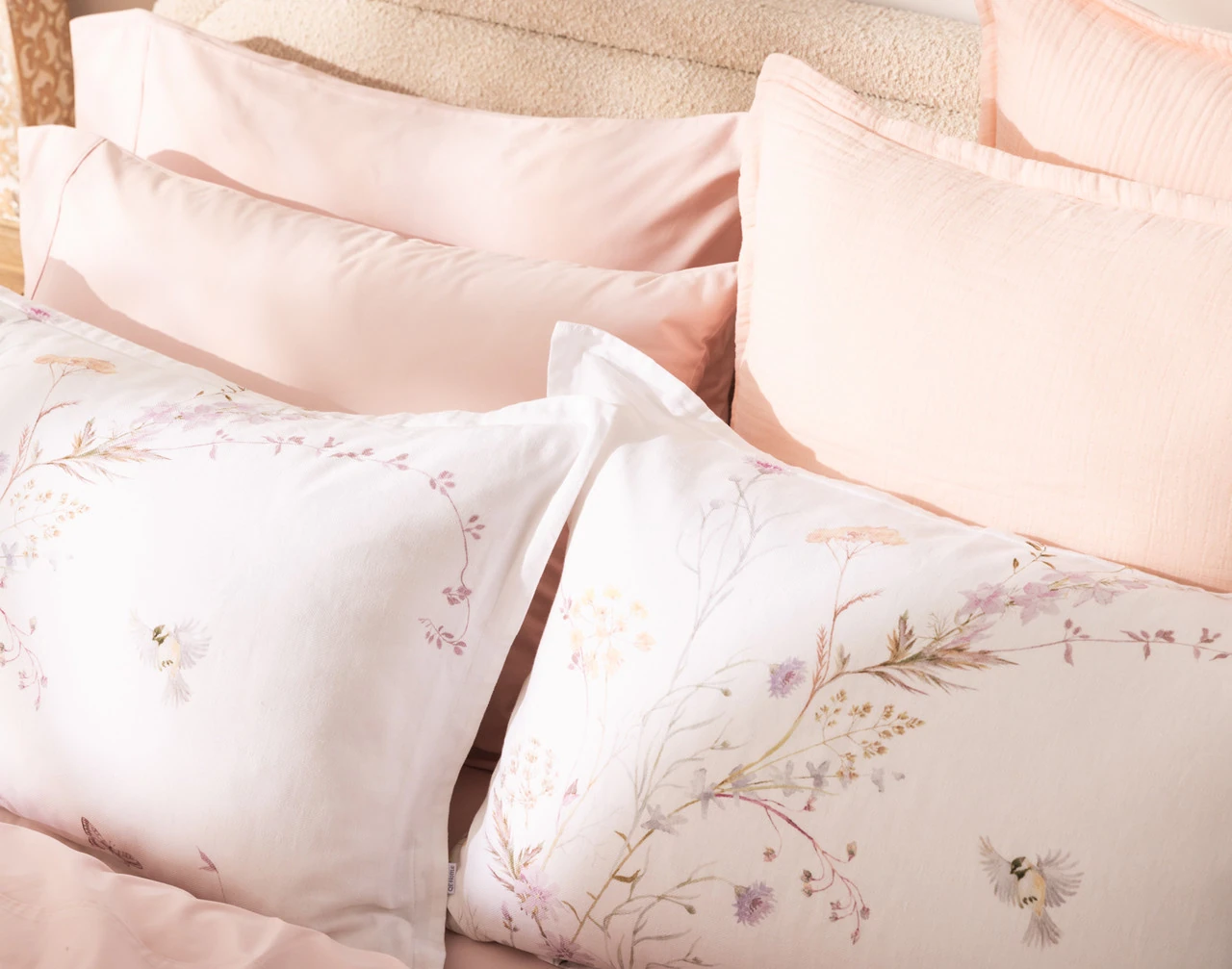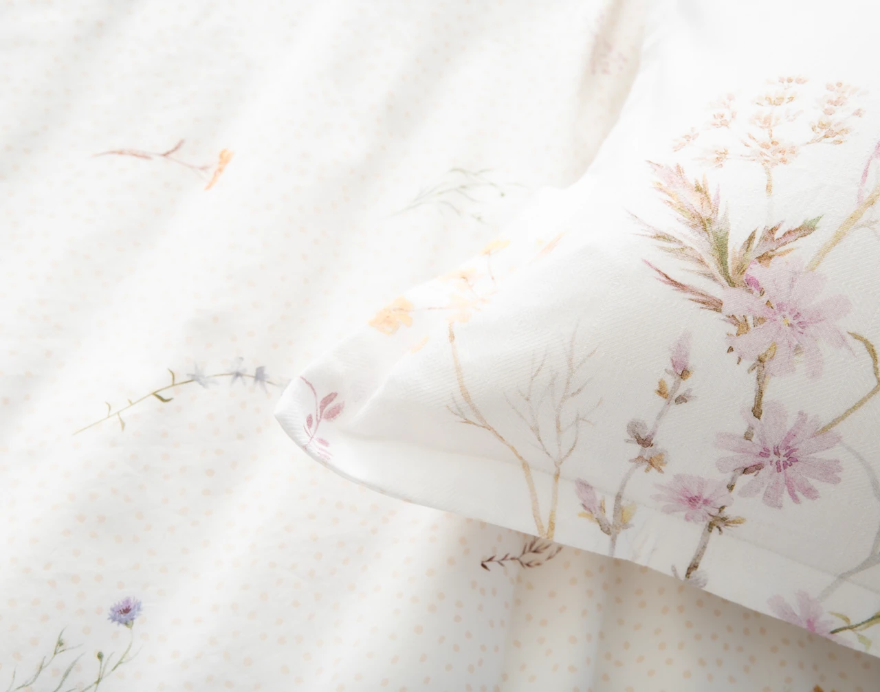 Dress your bed in delicate floral elegance with our Elysium Pillow Sham. Drawing inspiration from vintage botanical journals, Elysium features delicate wildflowers, a fluttering bird, and soft botanical sprigs across a fresh white ground like a pressed flower page in gentle washes of blush, gold and sage. The reverse side features a delicate floral repeat print against a soft orange-spotted background. Elysium is printed on a 100% cotton diamond dobby weave, adding a subtle texture that enhances the delicate artwork.