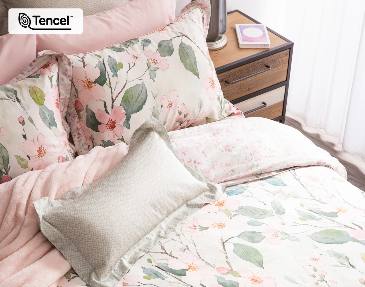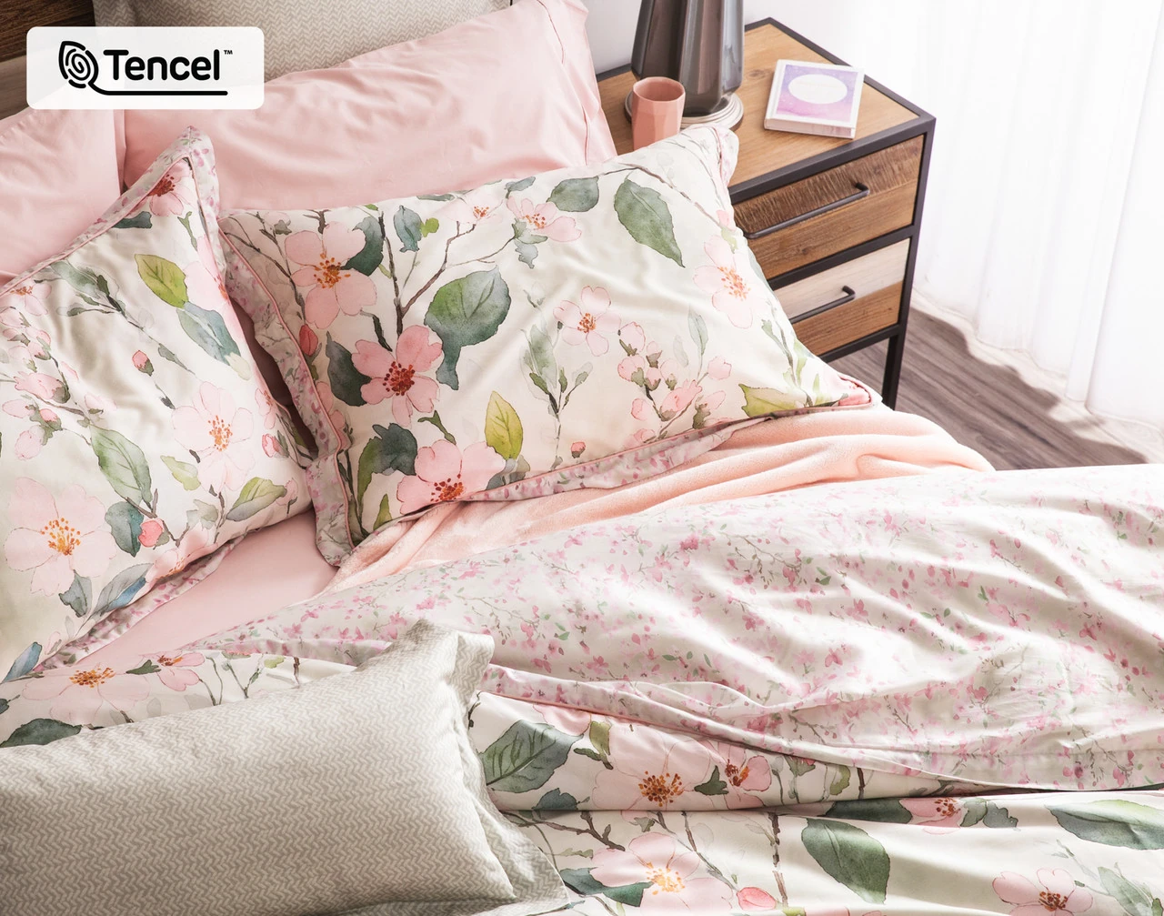Sleep in pink floral bliss with our Enamour Pillow Sham. An expressive watercolour design, Enamour features soft pink flowers and green leaves growing delicately on branches winding up the pillow. Crafted from a soft and buttery blend of TENCEL™ Lyocell and Cotton, our pillow sham is breathable and temperature-regulating for serenely fresh sleep. Enamour reverses to a coordinating pink floral design with small, dainty flowers on a soft green background.