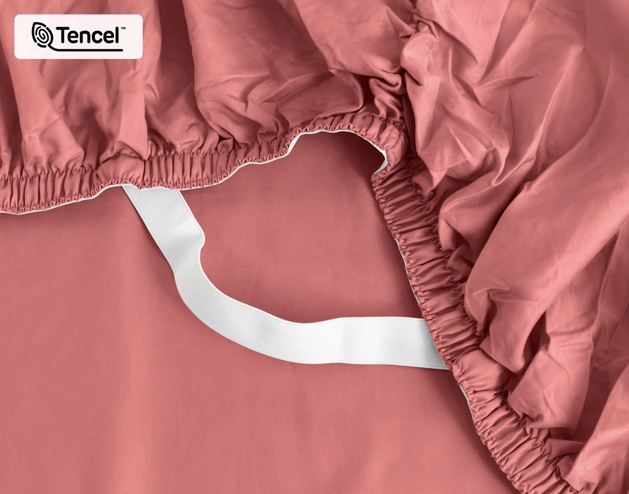 Buttery soft and breathable, our Eucalyptus Luxe TENCEL™ Lyocell Fitted Sheet in Raspberry Ice has a rich and lustrous texture that drapes beautifully across your bed and against your skin. Derived from natural wood materials including eucalyptus wood, the TENCEL™ Lyocell fibers in these sheets excel at moisture control and keeping bacteria away for a supremely fresh and healthy sleep, and are blended with ultra-cozy cotton for a soft touch and superior durability. Plus, knowing you’ve made a responsible choice for the environment helps too!
