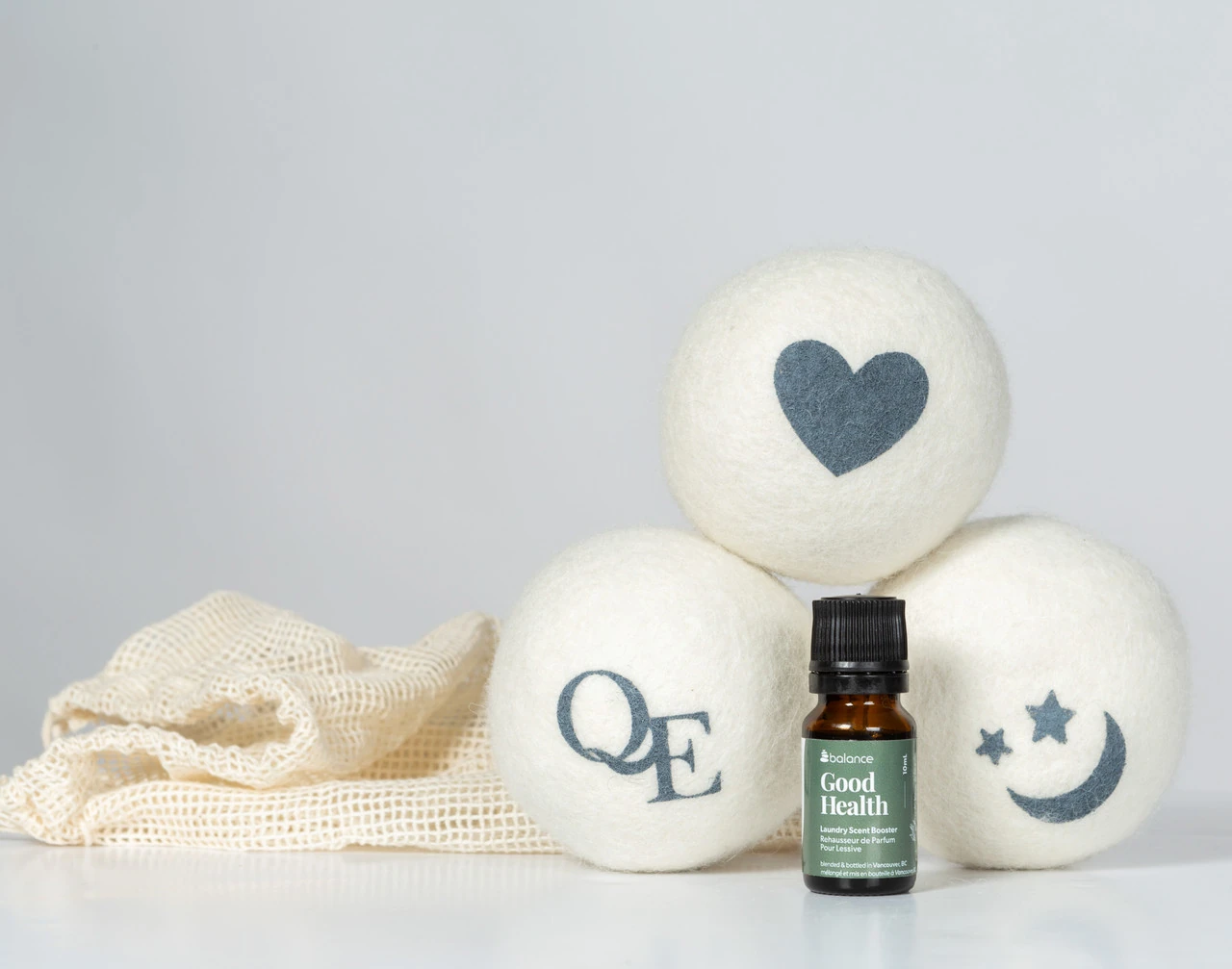 Give your laundry a cleaner, drier, and softer feel in no time with the help of our Linen Love dryer ball set and pure essential oil laundry scent booster. These 100% wool dryer balls reduce wrinkles and drying time by absorbing static cling, and come in a reusable mesh bag made from 100% organic cotton. Meanwhile, our Good Health pure essential oil scent booster will freshen your laundry with a warm natural fragrance, featuring spicy aromas of clove, lemon, cinnamon, eucalyptus, rosemary, thyme, and myrrh to help you feel refreshed.