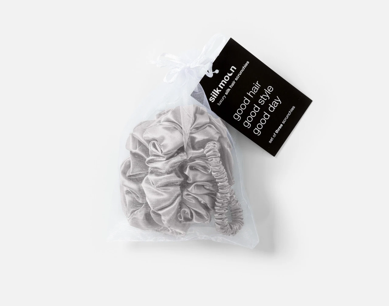 A treat for your tresses! Put your ponytail up in style with our Silver Mulberry Silk Scrunchie Set, made from lustrous 100% Mulberry Silk. Silk has less friction and tension than other hair ties, and is gentle to use on dry, damaged, and weak hair, reducing breakage and split ends and keeping it healthy while it's securely held. Their smooth surface is also less likely to leave those pesky grooves in hair the way other hair ties can, making them a convenient, must-have accessory for anyone wishing to show a little extra love to their hair. Complete with three different sizes, this set ensures you can treat your hair with both care and style on any occasion!