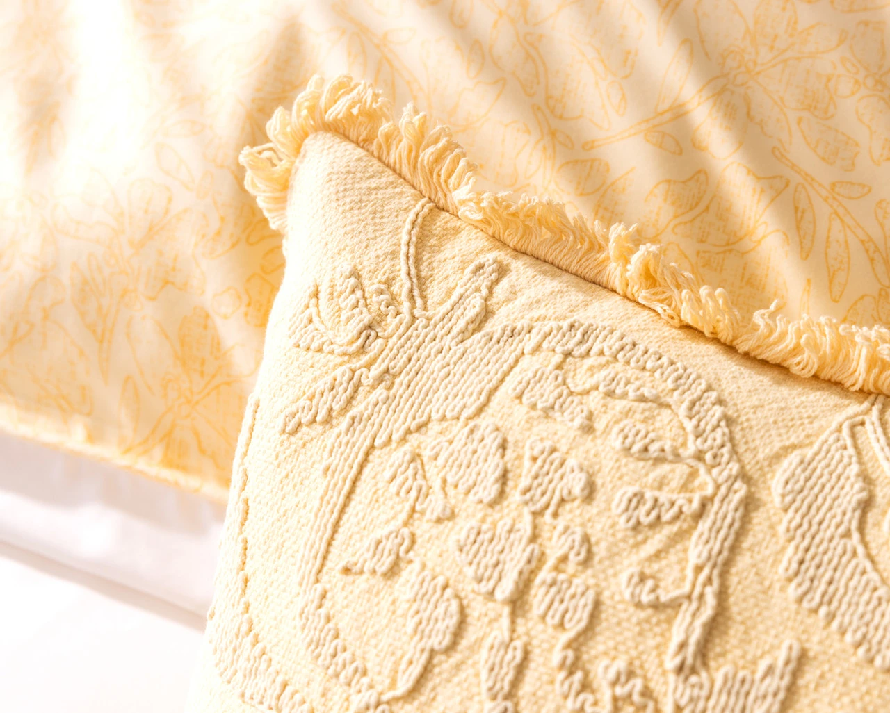 Details: Duvet cover and pillow shams reverse to a muted yellow rotary floral print. Euro sham features the same rotary floral print on both sides, and boudoir cushion cover has a textured floral main and matching solid reverse design. Duvet cover and pillow shams are finished with a subtle yellow piping, euro shams are finished with a white satin stitch and 1.5" self-flange border, and boudoir cushion cover is finished with a 1" fringe. Duvet cover includes 8 corner and side anchor ties that attach to duvet to keep in place and prevent shifting (twin sizes have six ties). All items have YKK zipper closures. Coordinating items sold separately.