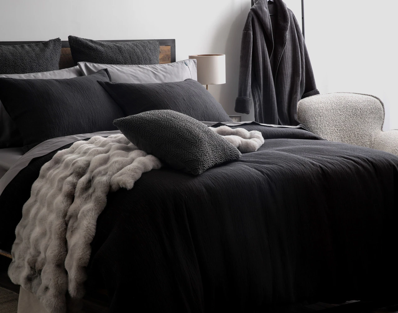 Details: Duvet cover and pillow shams feature a solid black sateen backing and are finished with a subtle 1" flange. Square cushion cover features a black matelassé jacquard design on the main side and a solid black sateen backing and is finished with a 2" flange. Duvet cover includes 8 corner and side anchor ties that attach to duvet to keep in place and prevent shifting (twin sizes have six ties). All items have YKK zipper closures. Coordinating items sold separately.