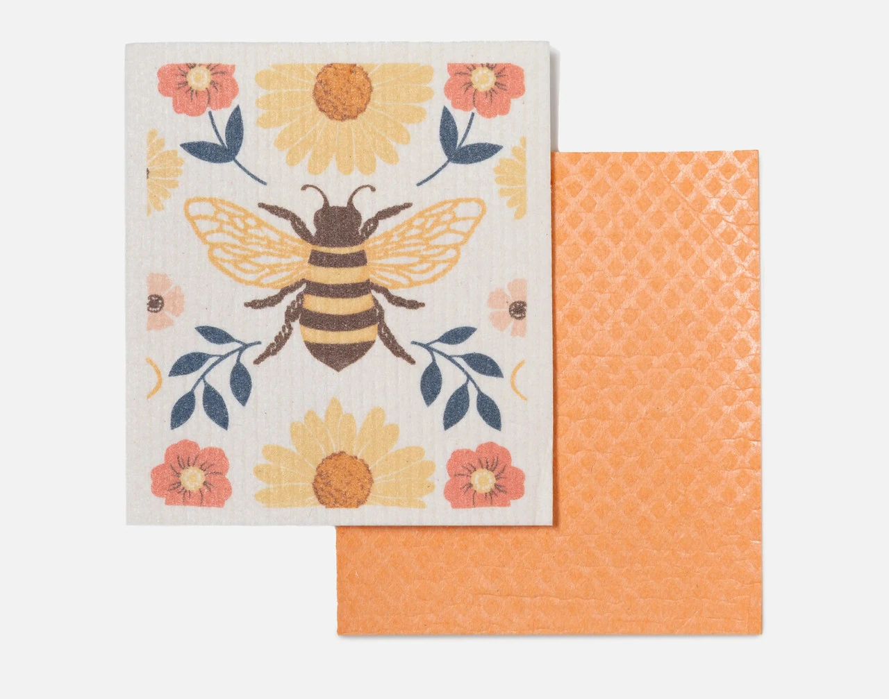 Give your dishes a sunny bright shine with our Bee Swedish Dishcloths! This small pair of square-shaped kitchen cloths are safe for all your dishes from plates and glass to stainless steel and granite, are made with an eco-friendly mix of cotton and cellulose material to save you from wasting paper towels, and are fully compostable once you're ready for a fresh new set. Featuring one patterned cloth with a flower-crowned bee on its surface, and a solid cream orange cloth for a coordinating pop of colour, this two-piece set is safe to be washed in any dishwasher or washing machine for up to three months of repeated cleaning convenience!