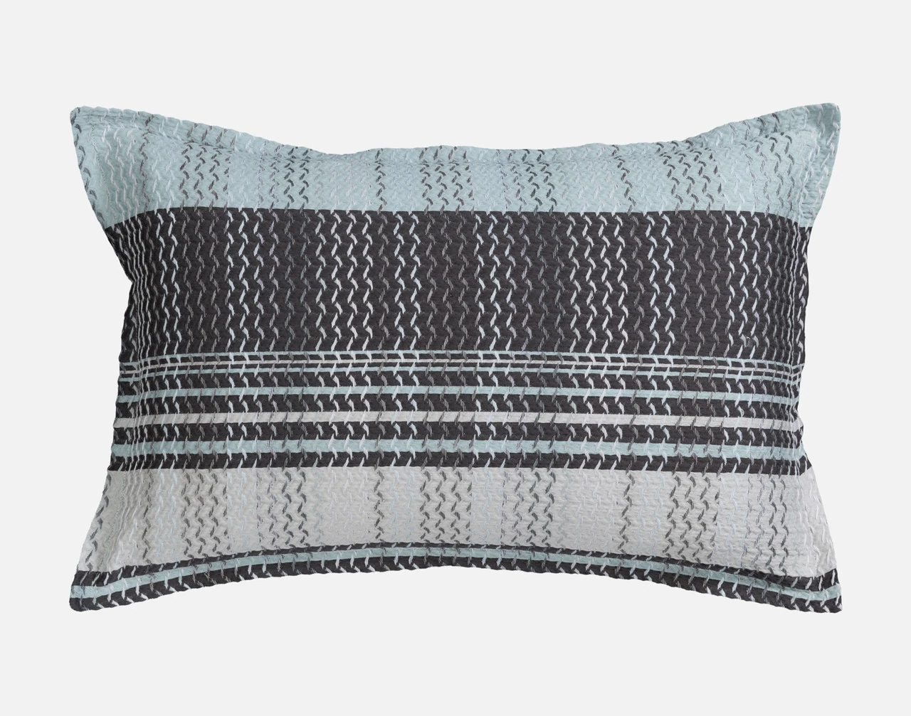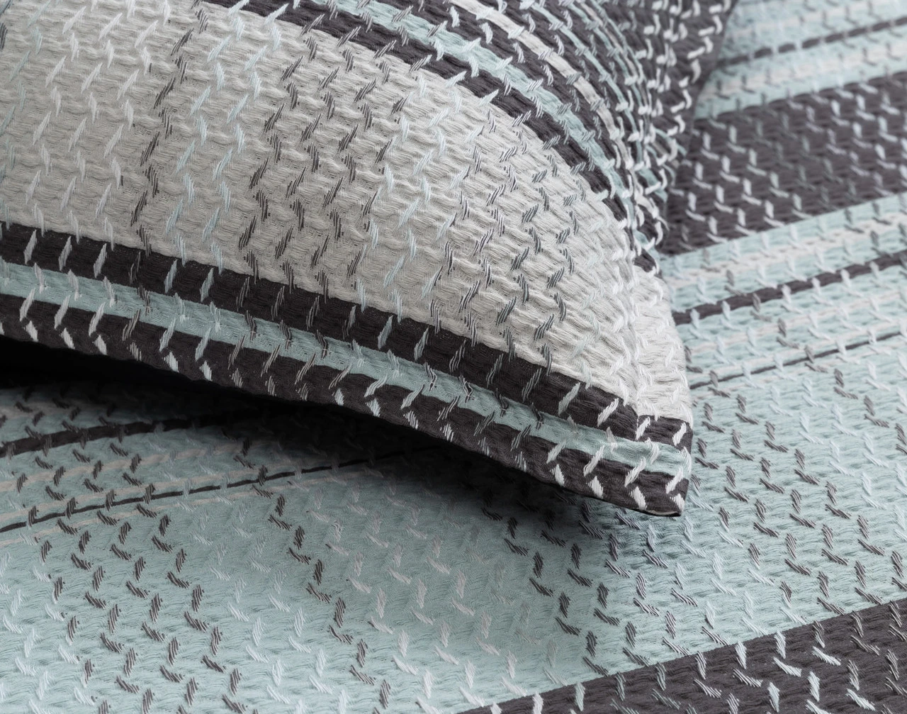 Details: Duvet cover and pillow shams features woven jacquard pattern with horizontal bands of charcoal, light grey, and surf blue tones in contrasting vertical zigzag motifs. Both duvet cover and pillow sham feature a 1-inch self-flange and reverse to a solid black long-staple 200 thread count cotton percale. Duvet cover features cotton twill ties in each corner to help anchor inserted duvet in place. All pieces feature hidden zipper entry.