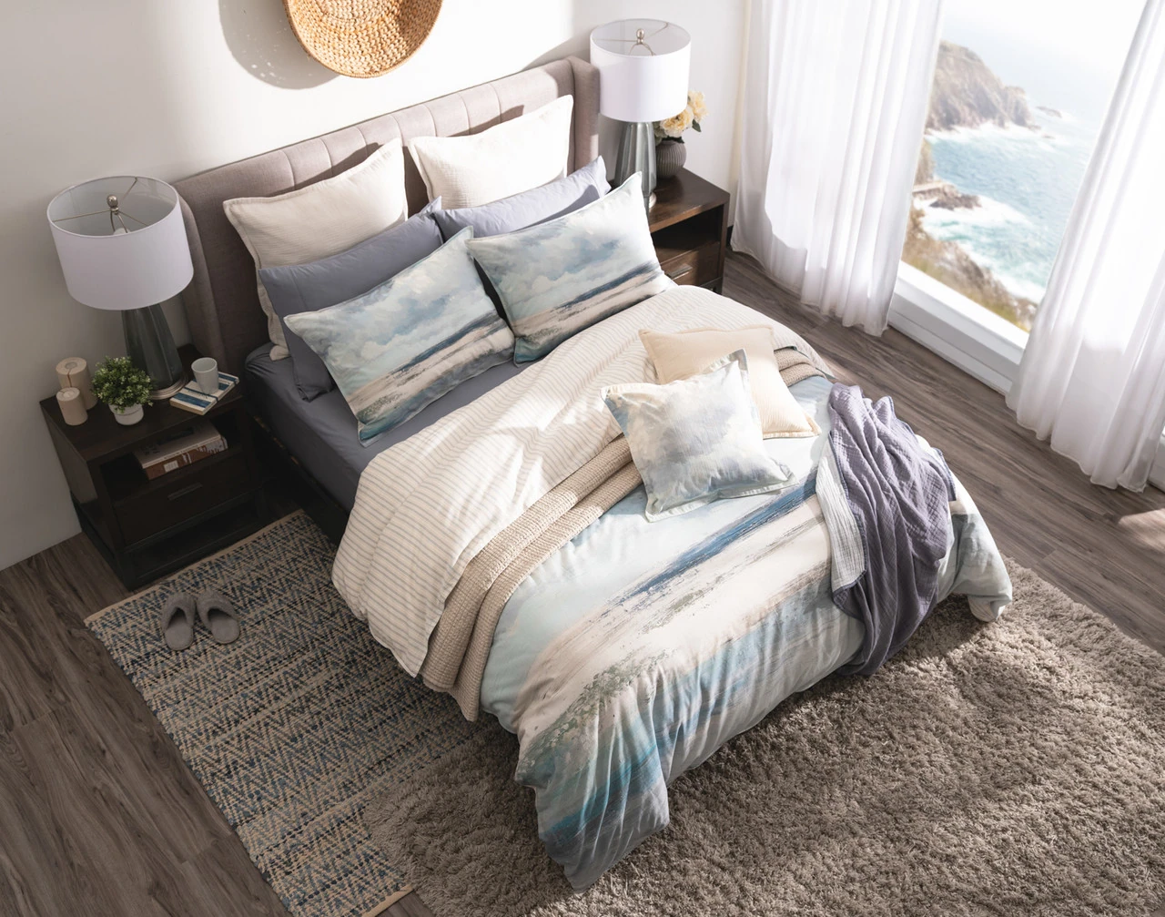 Details: Duvet Cover and Pillow Shams reverse to a coastal stripe design and are printed on a lyocell, cotton, and linen blend fabric. They are finished with a 1/4" self-flange with natural white rice stitching. Square Cushion Cover features clouds from the main design printed on a natural slub weave cotton and finished with a 1" self-flange. It reverses to a natural solid shade. Duvet cover includes 8 corner and side anchor ties that attach to duvet to keep in place and prevent shifting (twin sizes have six ties). All items have YKK zipper closures. Coordinating items sold separately.